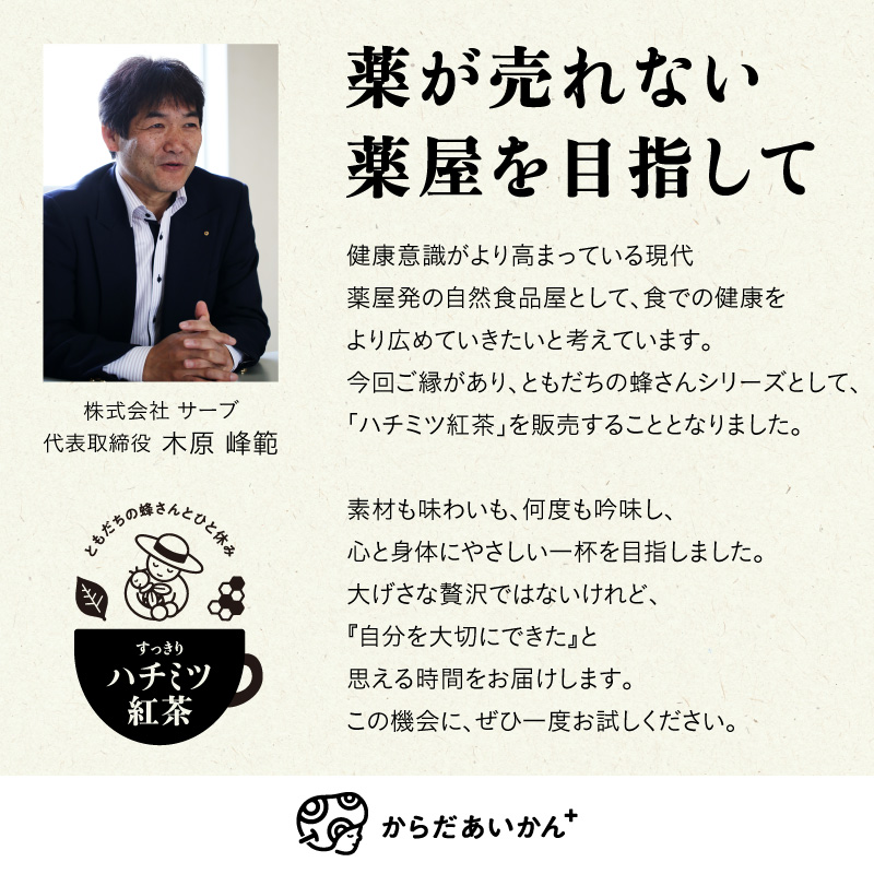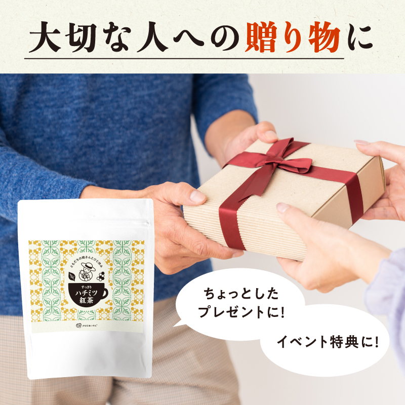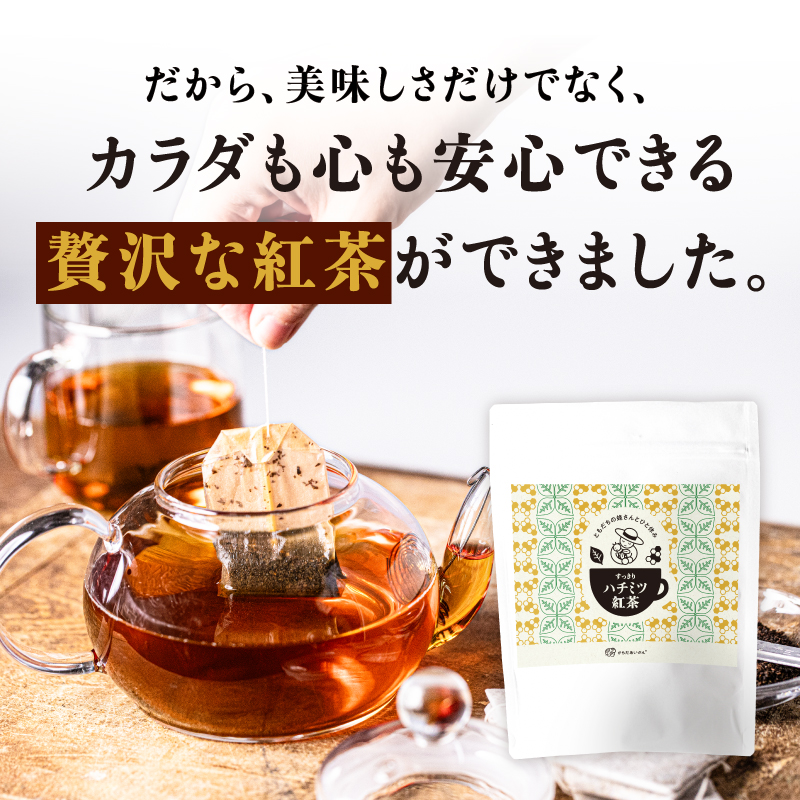 ハチミツ紅茶の中では数少ない、人工甘味料を使用せずに安心してお飲みいただけるようにつくりました。甘さは、すっきりとした自然由来の甘さです。 冷えても美味しく飲めるハチミツ紅茶をお楽しみください。【商品名】 ともだちの蜂さんとひと休み すっきりハチミツ紅茶