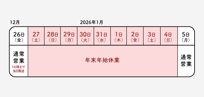 12月26日(金)16:00〜1月5日(月)10:00までのご注文は1月5日(月)に発送いたします。